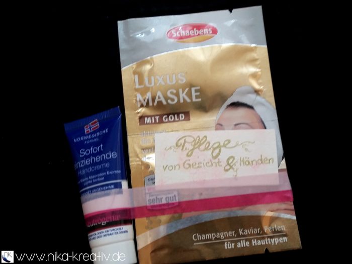 Und last but not least: Ein bisschen Wohlfühl-Kosmetik. Ich habe mich für diese schöne, gold verpackte Maske und eine kleine Handcreme entschieden. Beides kann man im Herbst finde ich sehr gut gebrauchen und es rundet das Kuschelpaket ab.