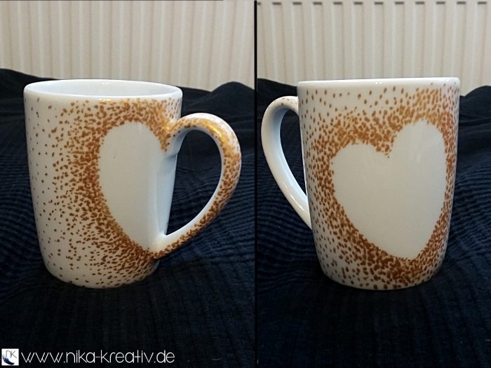 Damit der Tee auch stilvoll getrunken werden kann, habe ich noch eine Tasse selber gestaltet. Das Design habe ich bei Pinterest entdeckt (wenn ihr hier klickt, kommt ihr zur Inspiration). Man braucht nur eine weiße Tasse und einen goldenen Porzellanstift. Seid gewarnt: Die Herzform freihand schön hinzubekommen, ist auf der runden Tasse etwas kniffelig. Wer hier sicher gehen möchte, kann sich aber einfach eine Schablone basteln und auflegen.