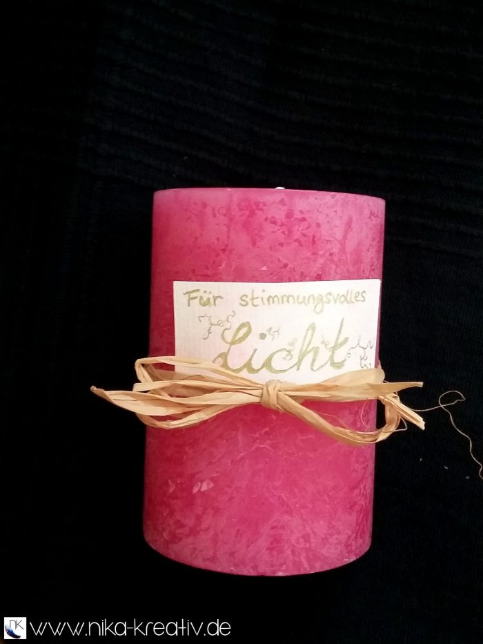 An erster Stelle: Natürlich eine Kerze. Ich denke, die darf in einem Herbst-Kuschelpaket einfach nicht fehlen. Weil ich mein Paket in den Farben Gold und Pink gehalten habe, hat meine Kerze natürlich die entsprechende Farbe. Man könnte sie auch noch beschreiben oder mit einem Muster versehen, wie ich in meinem letzten Beitrag „Kerzen selber bemalen“ ausführlich gezeigt habe. In diesem Fall wollte ich jedoch eine schlichte, einfarbige Kerze haben.