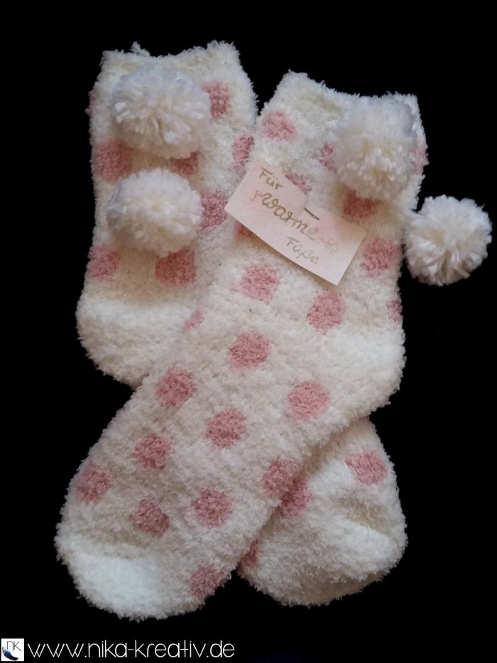 Was für ein Kuschelpaket ebenfalls unverzichtbar ist, sind Kuschelsocken. Diese hier habe ich bei Rossmann gefunden und die Bommel selber drangenäht. Dafür habe ich einfach aus weißer Wolle kleine Pompoms gemacht und diese etwas versetzt von Hand an die Socken genäht. Wenn man sie beim Waschen in einen Wäschebeutel tut, müssten sie das eigentlich überleben.