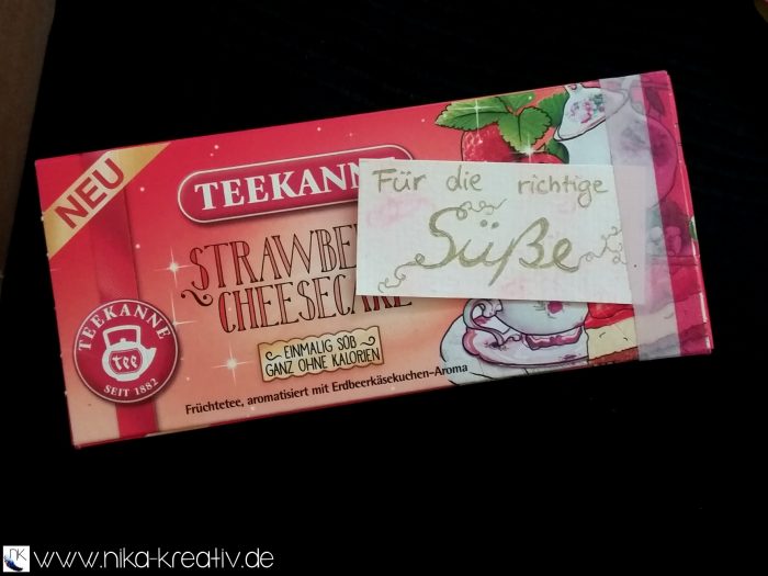 Herbstzeit ist Teezeit, also darf ein Päckchen Tee natürlich nicht fehlen. Hier kann man zum Beispiel den Lieblingstee des/der Beschenkten wählen – in meinem Fall passt die Packung sogar farblich super zum Rest.